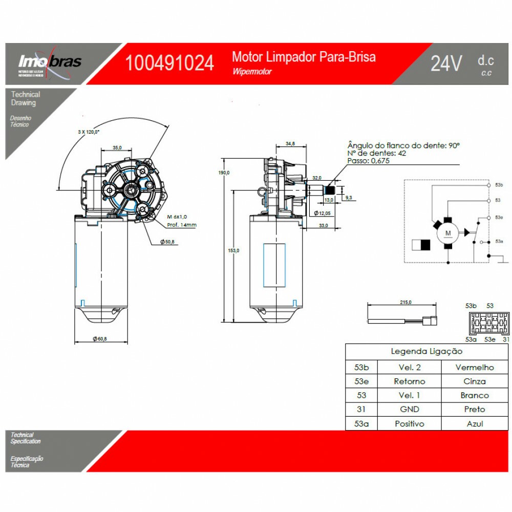 O Motor de Limpador de Para-Brisa 24V 03 Furos Moderno Eixo Estriado 38Nm Imobras é um motor elétrico de corrente contínua projetado para o acionamento do sistema limpador de para-brisa. Com fixação por 03 furos no padrão moderno, eixo do tipo estriado e torque de 38 Nm, oferece força elevada para operação em veículos pesados com para-brisas de grande porte.